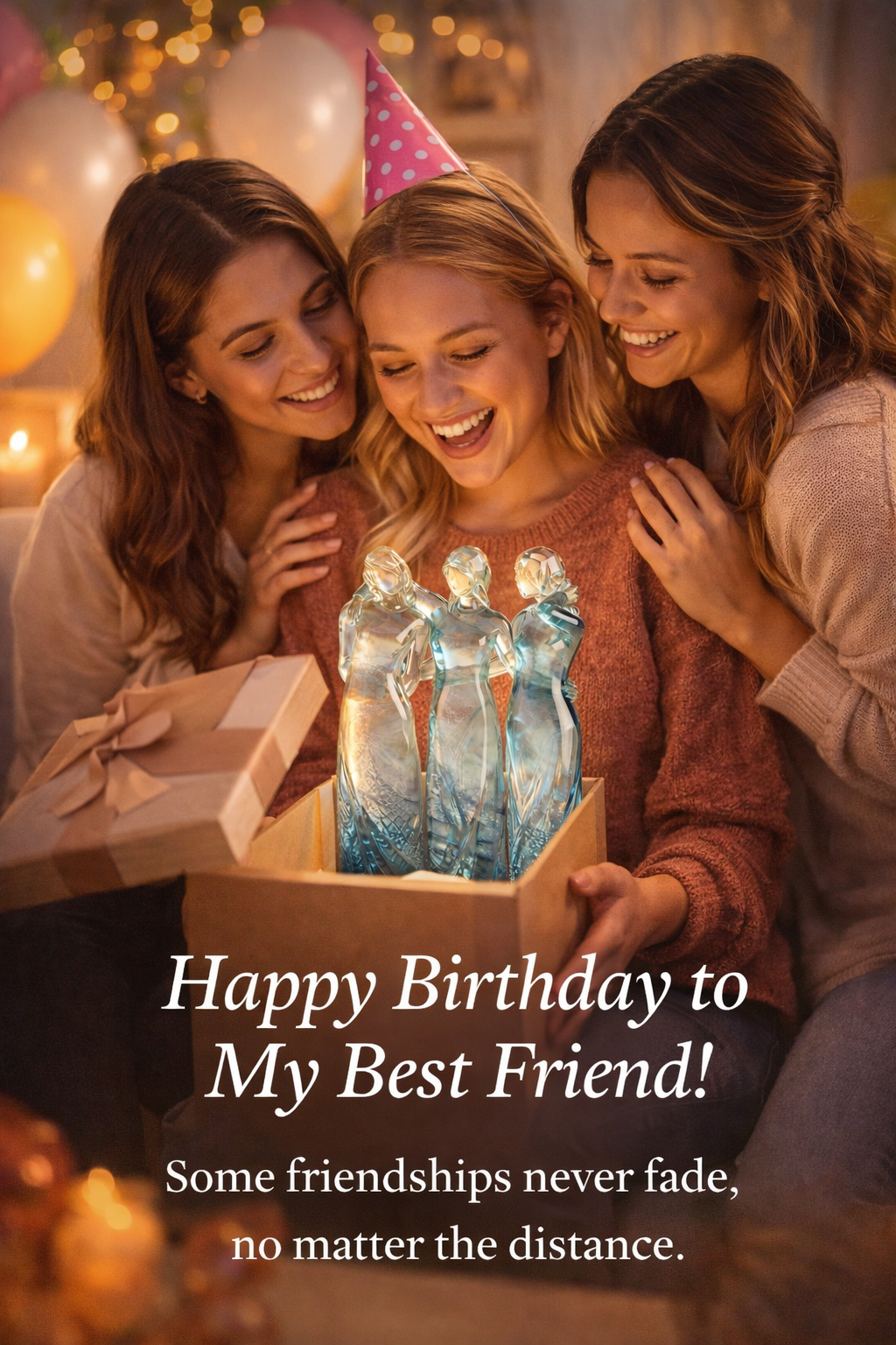 Handcrafted with a smooth ocean-inspired gradient, it captures three women standing together — arms entwined, hearts connected — a symbol of loyalty, support, and everlasting affection.