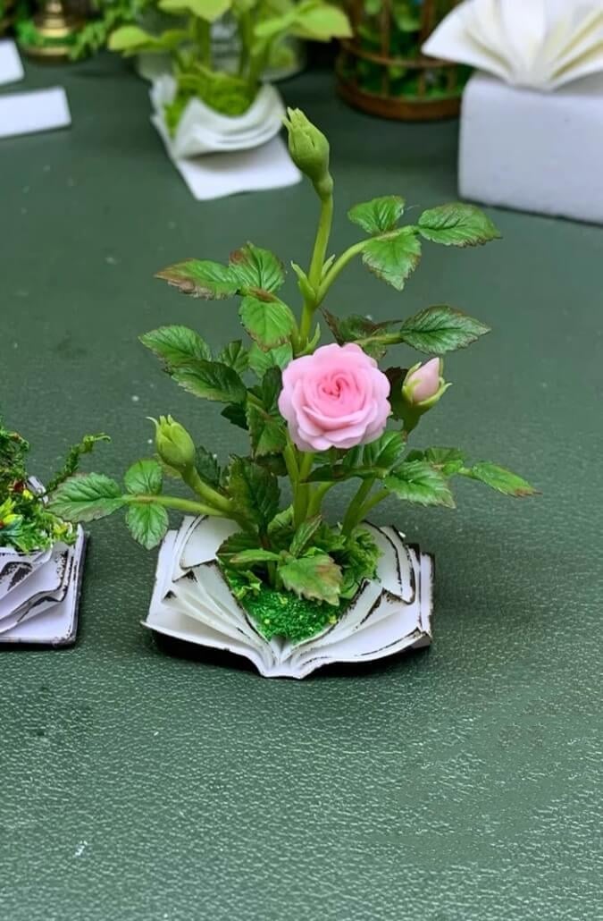 Each flower emerges gracefully from the carefully sculpted pages of a classic-looking book.