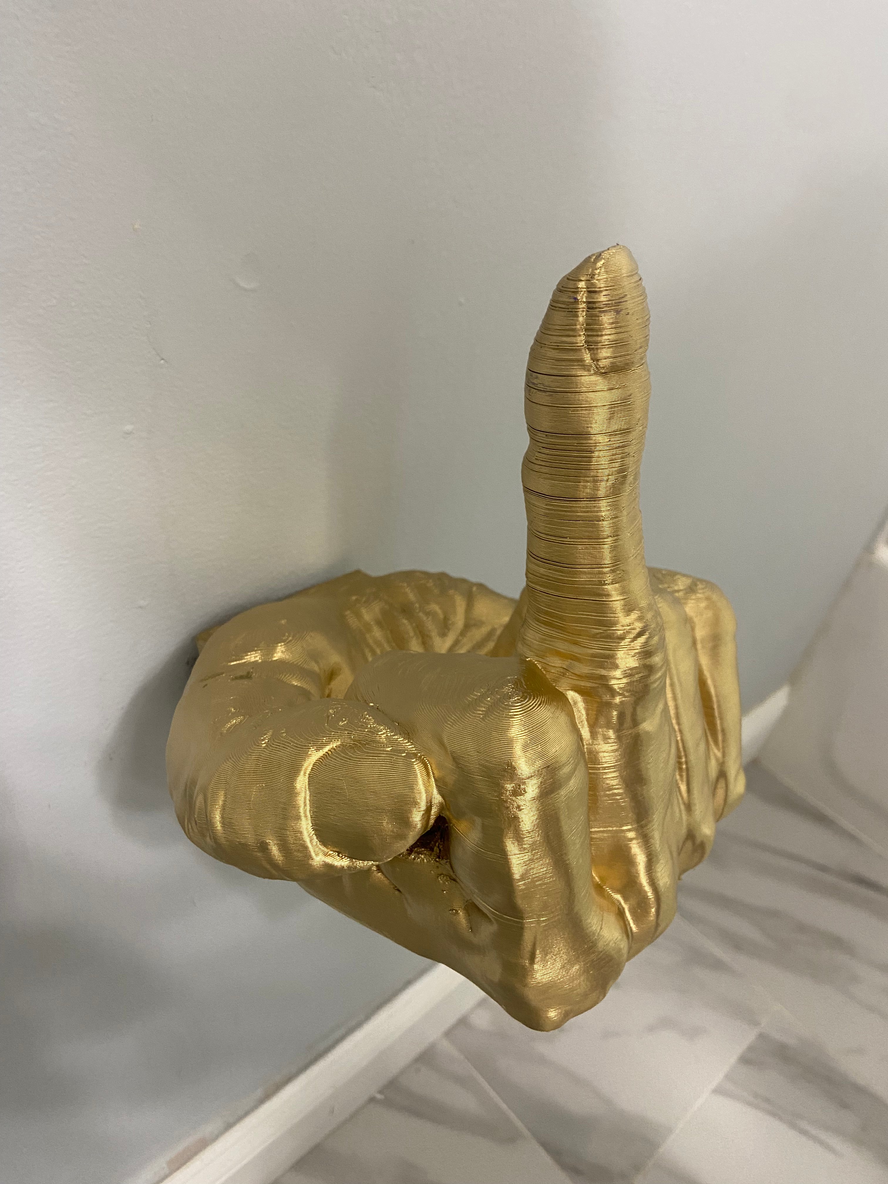Sure, the middle finger toilet paper holder is fully functional to hold your most precious belonging while using the abode, but it's also a work of art! The holder is gold in color making it look like some sort of trophy, or valuable sculpture!