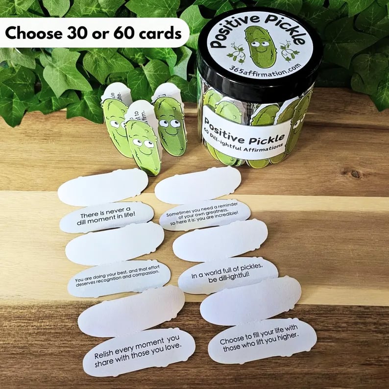 𝗖𝗢𝗡𝗧𝗘𝗡𝗧𝗦: Choose 30 or 60 Positive Pickle Affirmation Cards