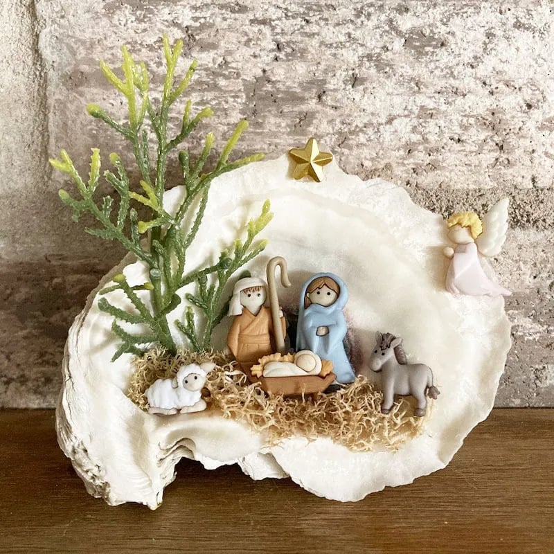 This handmade Christmas ornament showcases the Christian nativity scene, including Baby Jesus, Joseph, and Mary, set upon an oyster shell embellished with bright gold star.A gorgeous handmade and original Nativity ornament set in an oyster shell. I love the inside of these shells and thought it would be the perfect background for this glorious nativity scene.
