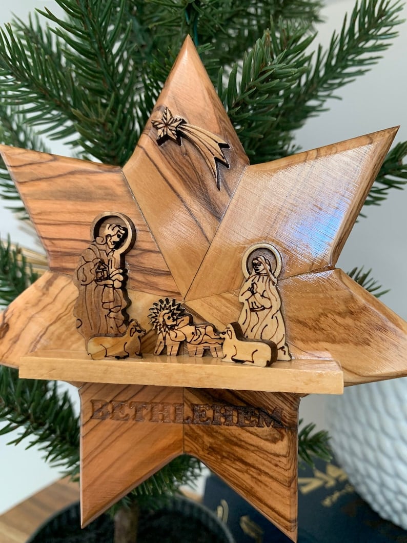 ✝️This handcrafted wooden nativity star stands amidst shaggy fir and colorful spherical Christmas decorations for a uniquely reverent and warm display. Carefully crafted, it also serves as a meaningful nativity set decoration - a beautiful way to celebrate the holiday season.