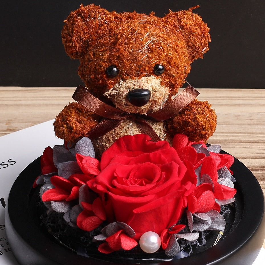 Roses & Teddy Bears have always been a universal symbol of Love. We have crafted a unique combination of both withahandmade Teddy Bear &a preserved ever-lasting rosejust likeyour love.