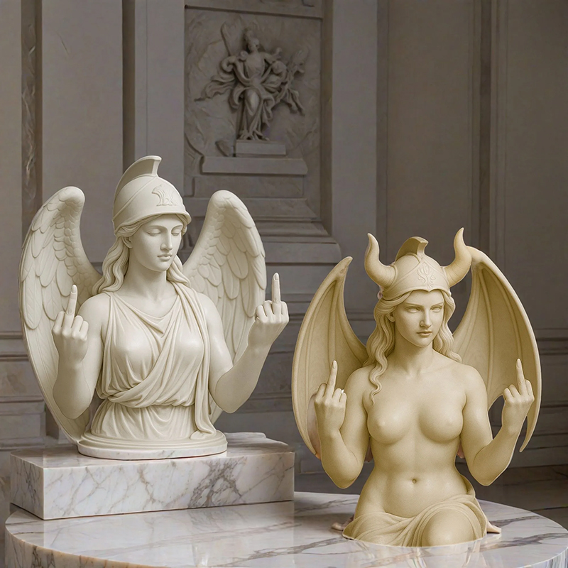 In this sculpture, the classical image of Athena is juxtaposed with a modern, satirical gesture, creating an undeniable tension. She remains silent, yet responds to the world with a resolute stance: wisdom can be calm, strength can be satirical, and rebellion can be elegant.